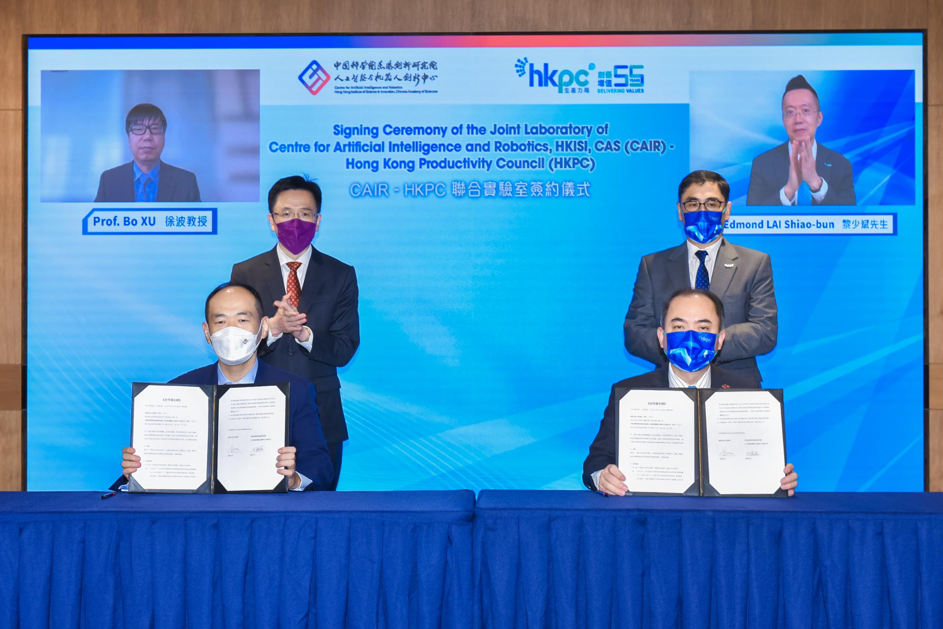 在CAIR-HKPC簽約儀式環節,創新科技及工業局局長孫東、創新中心主任,中科院自動化所所長徐波、創新中心執行副主任劉宏斌、生產力局總裁畢堅文、生產力局首席數碼總監黎少斌和生產力局機械人及人工智能部總經理葛明等共同出席簽約儀式。劉宏斌博士與葛明博士代表雙方簽署了合作協議。