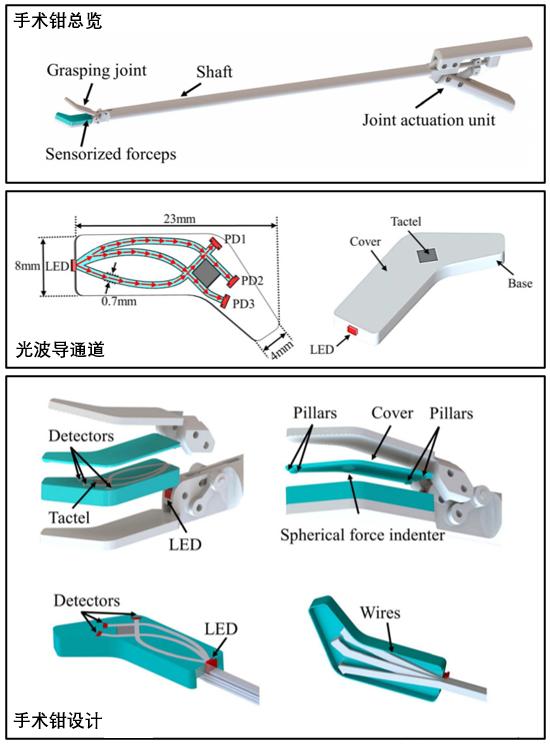 为了解决这个问题,双方科研人员研发出了一种应用于微创手术器械的高精度三维接触力传感器。这种传感器体积很小并具有柔性特点,可以装在微创手术器械的末端曲面,感应手术时用到的多种三维接触力,比如推、拉、夹的力度和方向。该技术基于光波导原理,光在波导中传输时如果波导受到力的作用,光的传输特性(如强度)会改变。通过测量接触力对全反射的干扰程度可以检测力的大小和方向,从而使医生知道他们用了多少力,使手术操作更加精确。实验结果显示,这种传感器能够准确地测量0至3N的力,平均误差仅有0.089N。