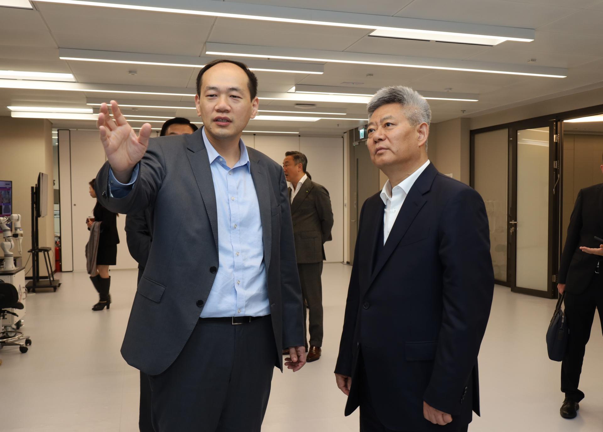 在参观期间,刘宏斌主任向徐新荣主席介绍了CAIR在人工智能体(Embodied AI)手术室平台技术上的最新进展,其中包括了多模态AI手术大模型CARES Copilot对图像、视频以及长文本的强大理解能力,以及全自动超声检测系统Ultrasound Copilot、AI现实增强技术和数字孪生系统的创新成果。CAIR的科研团队坚信,医疗手术的未来趋势将是微创化、数字化、智能化,并逐步走向标准化。