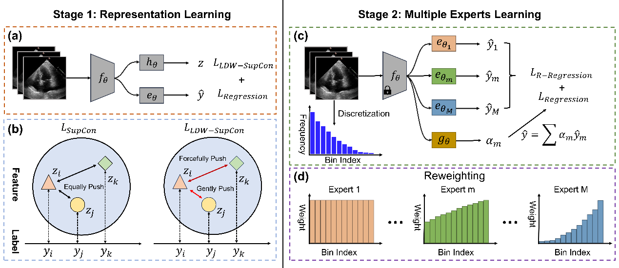 为了解决这一问题,研究人员提出了一种多专家网络模型EchoMEN,旨在通过集成学习来解决EF回归中的数据不平衡难题。CAIR博士生赖嵩介绍说,EchoMEN采用了两阶段解耦的训练策略。第一阶段引入了标签距离加权监督对比损失函数,通过考虑负样本对标签的距离关系,增强了模型表示学习能力。第二阶段训练了一个多专家模型,各个专家头专家学习EF值的不同区域,以平衡地处理不同的患者群体。