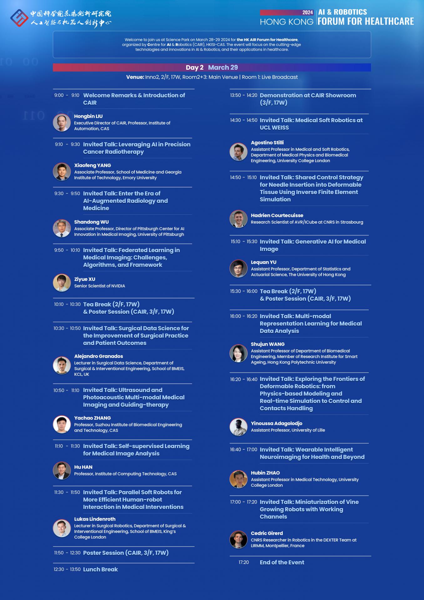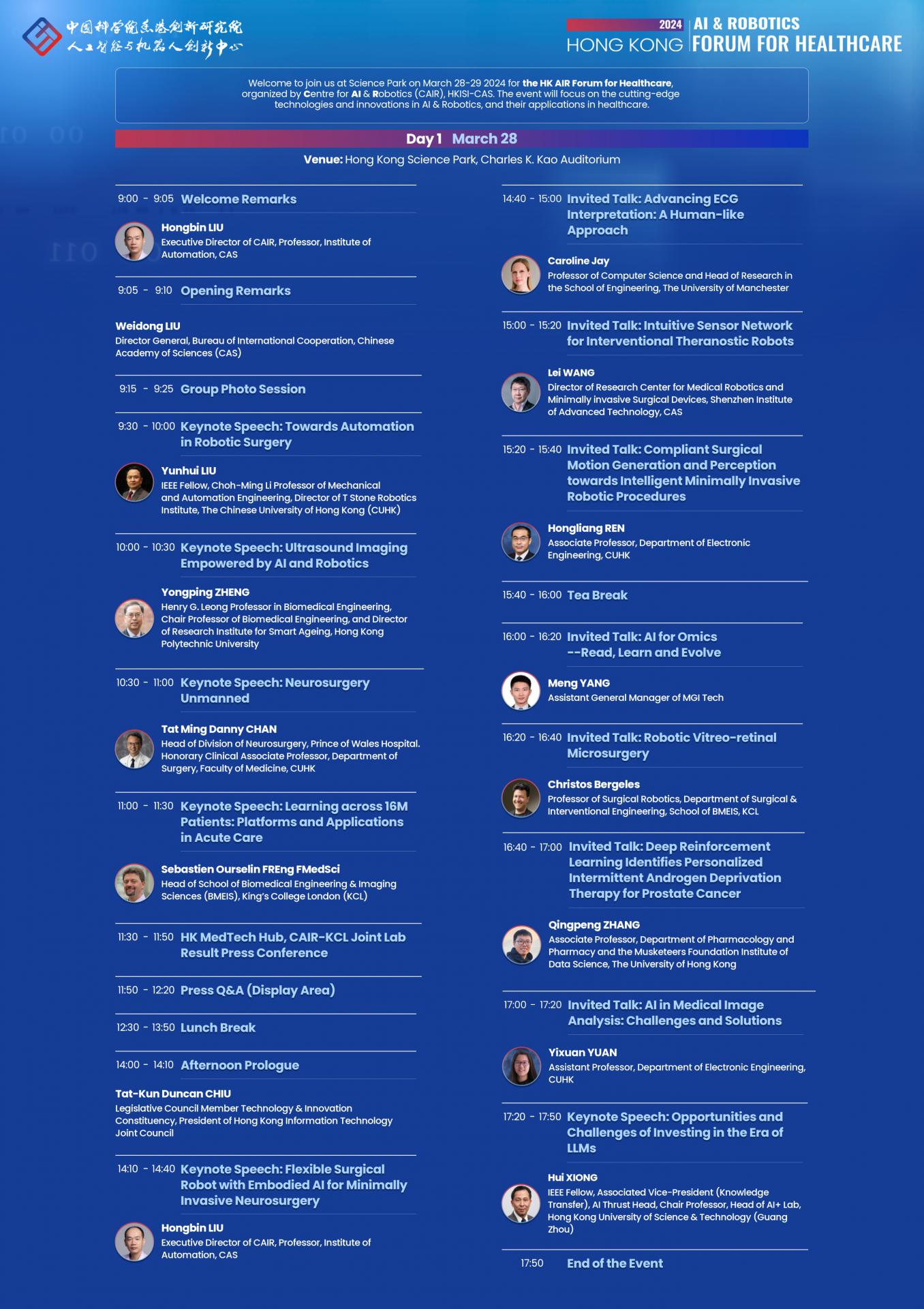 【March 28, 2024, Hong Kong】In this data-driven era, artificial intelligence and robotics technologies are rapidly reshaping people's lifestyles, with their profound impact in the field of medicine and healthcare becoming increasingly evident. From image-assisted diagnosis to intelligent health management, artificial intelligence is emerging as a pivotal force propelling medical progress. From March 28th to 29th, the "CAIR Hong Kong Artificial Intelligence and Robotics in Healthcare Forum," organized by the Centre for Artificial Intelligence and Robotics (CAIR), Hong Kong Institute of Science & Innovation, Chinese Academy of Sciences, was successfully held at the Hong Kong Science Park. This forum convened experts and scholars from around the world to explore innovative applications of artificial intelligence and robotics in the medical field through a series of stimulating thematic discussions, delving into how cutting-edge technology can enhance the quality of healthcare services, optimize resource allocation, improve medical efficiency, and foster the development of medical research.