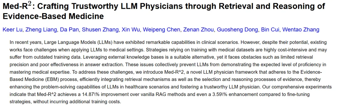 1月21日,北京大学与百川智能联合团队发布Med-R2框架。该研究通过整合检索机制与循证医学(EBM)推理流程,解决大型语言模型(LLMs)在医疗应用中的关键挑战。传统方法依赖昂贵的数据微调且易知识过时,而检索增强生成(RAG)系统则面临检索精度低、答案提取能力弱的问题。Med-R2针对性地设计了以下核心机制: