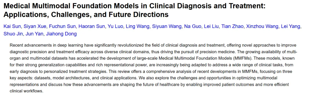清华大学生物医学工程与计算机科学系于2024年12月4日发布了一项聚焦医学多模态基础模型(MMFMs)最新发展的研究,强调了这些模型在提升临床诊断的精确度和治疗计划的个性化中的重要作用。MMFMs,包括医学多模态视觉基础模型(MMVFMs)和医学多模态视觉语言基础模型(MMVLFMs),通过整合大规模、多组织器官、多模态的数据集,展现出了优异的泛化能力,这得益于模型在多种医学图像任务上的预训练和后续的任务特定微调。这些模型在处理医学图像分割、分类、检测、配准以及临床报告生成等下游任务时展现出的高性能,证明了它们在临床应用中的巨大潜力。尽管如此,MMFMs在实际医疗环境中的应用仍然面临诸多挑战,包括但不限于数据集规模和多样性、模型在不同医学成像模态间的一致性问题,以及如何处理稀缺的标注数据。