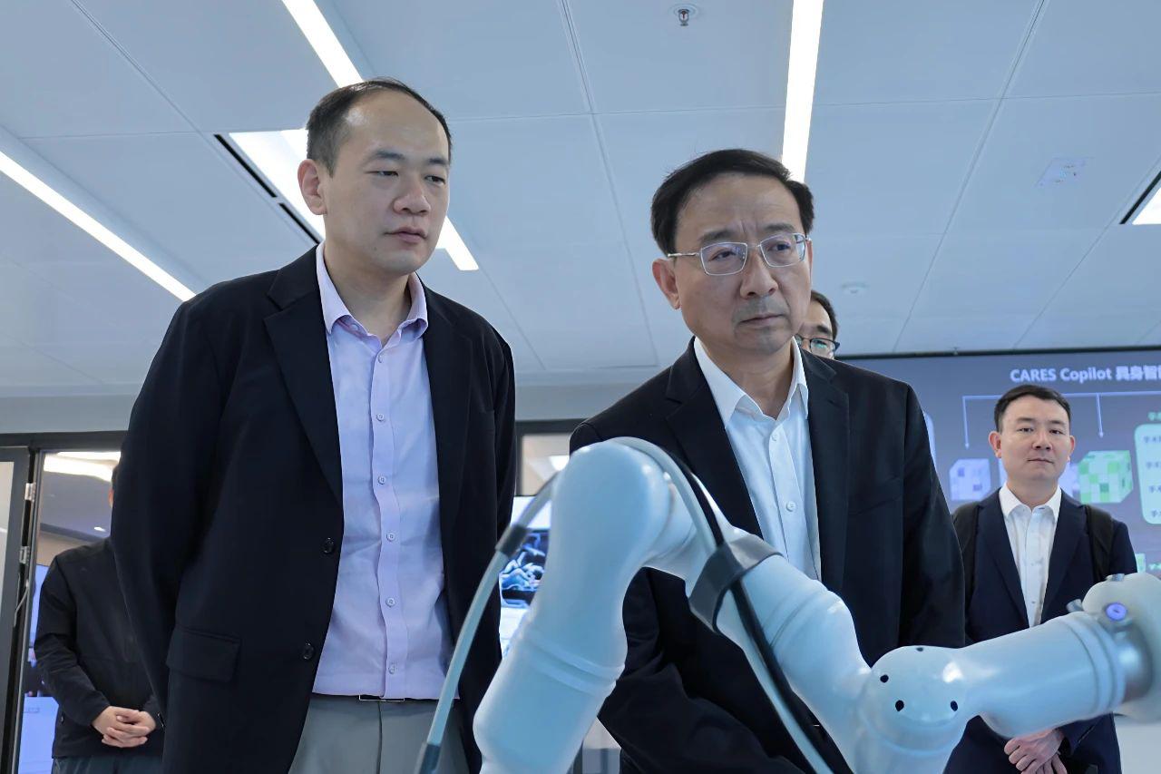 在参观过程中,CAIR刘宏斌研究员及研发团队向参访团介绍了具身智能手术室技术平台的前沿成果,包括多模态手术大模型CARES Copilot、具身智能超声自动扫查系统、微创柔性脑手术机器人MicroNeuro 等自主研发成果以及产业化的进展,获得了在场产业界领导的高度认可。