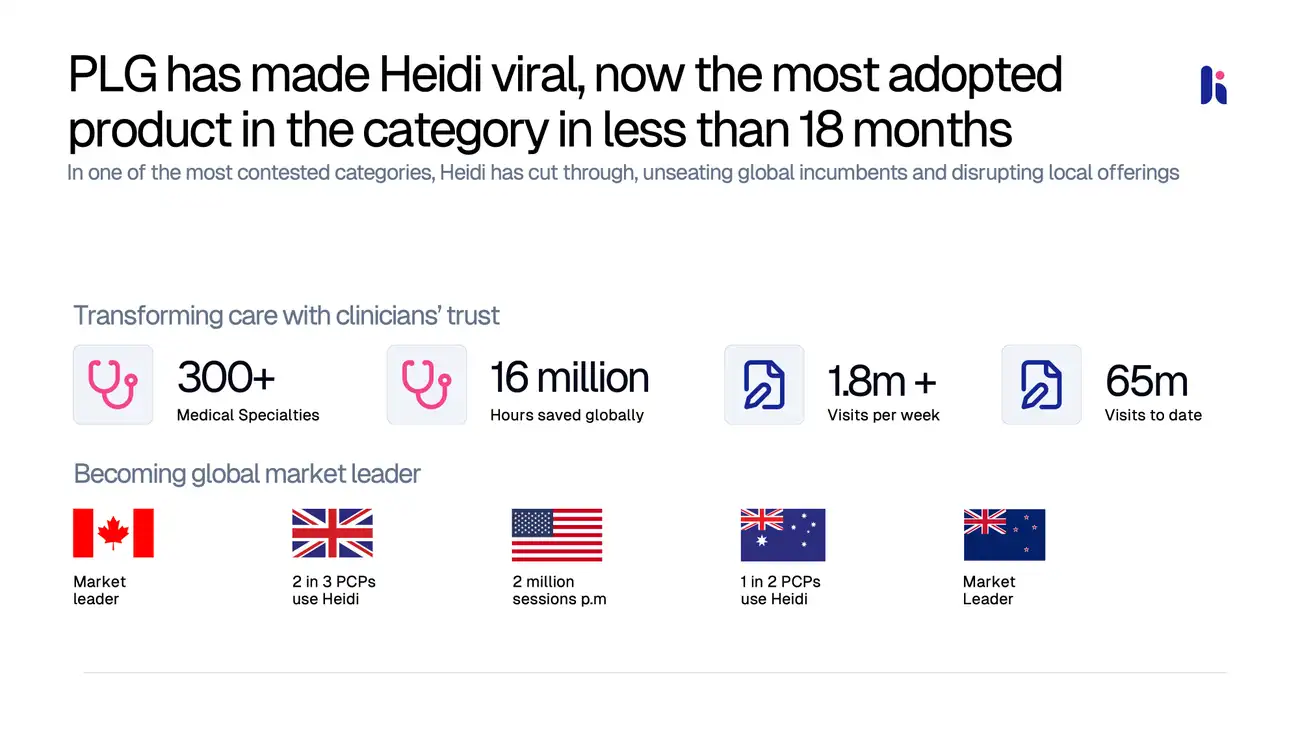 由创伤外科医生Tom Kelly在墨尔本创立的健康科技初创公司Heidi Health,仅用18个月就获得了1亿美元的融资,用户量突破200万,覆盖全球116个国家,成为医疗技术领域增长最快的公司之一。