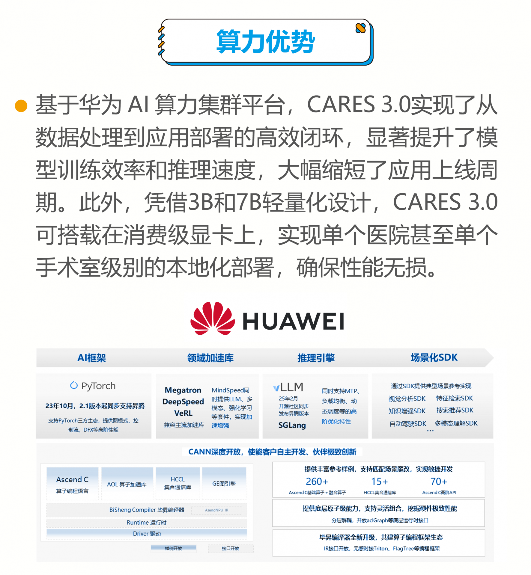 10月26日,在第三届香港具身智能医疗科技论坛上,中国科学院香港创新研究院人工智能与机器人创新中心(CAIR)与华为联合推出了新一代多模态医疗AI大模型CARES 3.0。该模型由CAIR基于众多临床医生的诊疗决策需求而研发,并在华为AI算力集群平台上训练完成,能够理解CT、MRI、X光等全模态医学影像,完成智能诊断、报告生成、循证调研等多项临床任务,为医生开展诊断提供了“辅助驾驶”新模式。