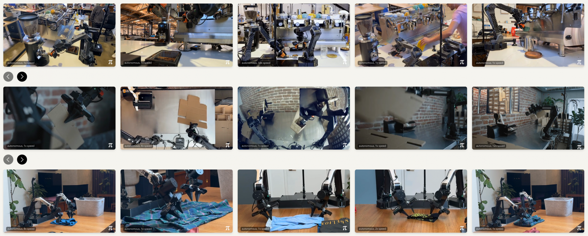 通过离线强化学习预训练、示范数据微调以及真实环境中收集的经验训练,π*0.6在真实世界任务中表现出色,以超过90%的成功率完成多项复杂操作,包括组装纸箱的精细物理操作、应对多种布料特性的衣物折叠以及覆盖长操作序列的意式咖啡制作等,其吞吐量和效率均比早期版本提升两倍以上,满足了高效与高可靠性的实际应用需求。