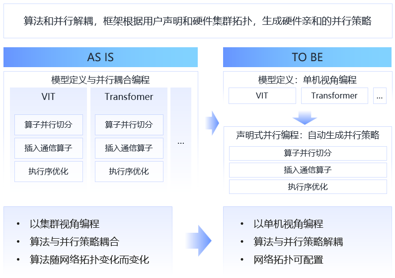 采用声明式并行范式,解耦并行策略与模型逻辑,融合超节点调度与全局协同。用户以单卡视角编写代码,系统自动推导分布式策略,支持多模态大模型组装,开创“Triton范式”,实现“编写即单卡,运行即分布式”的高效体验。