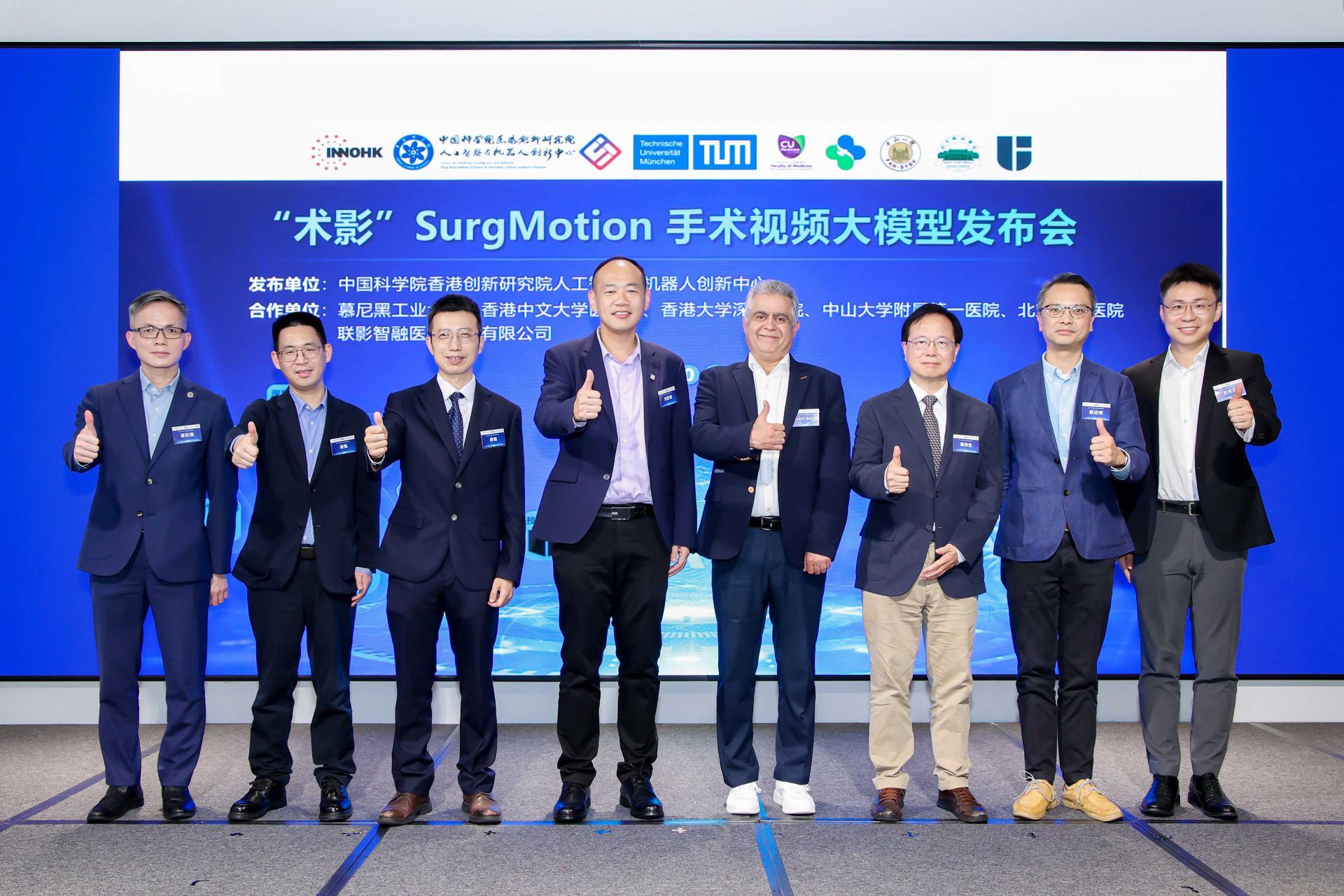 发布会上国内外知名学者、临床专家、产业代表和多家媒体齐聚一堂,CAIR主任、研究员刘宏斌,欧洲科学院院士、慕尼黑工业大学教授及CAMP实验部主任Nassir Navab,香港大学深圳医院神经医学中心名誉顾问医师、香港大学外科学临床教授潘伟生,中山大学附属第一医院呼吸与危重症医学科副主任、主任医师廖槐,香港中文大学医学院外科学系名誉临床副教授及神经外科组主任陈达明,联影智融医疗科技有限公司副总裁谢强,河套发展署科技与人才部副部长王元孟,香港科技园公司业务发展副总监容红强共同见证了这一AI外科手术领域的里程碑式突破。