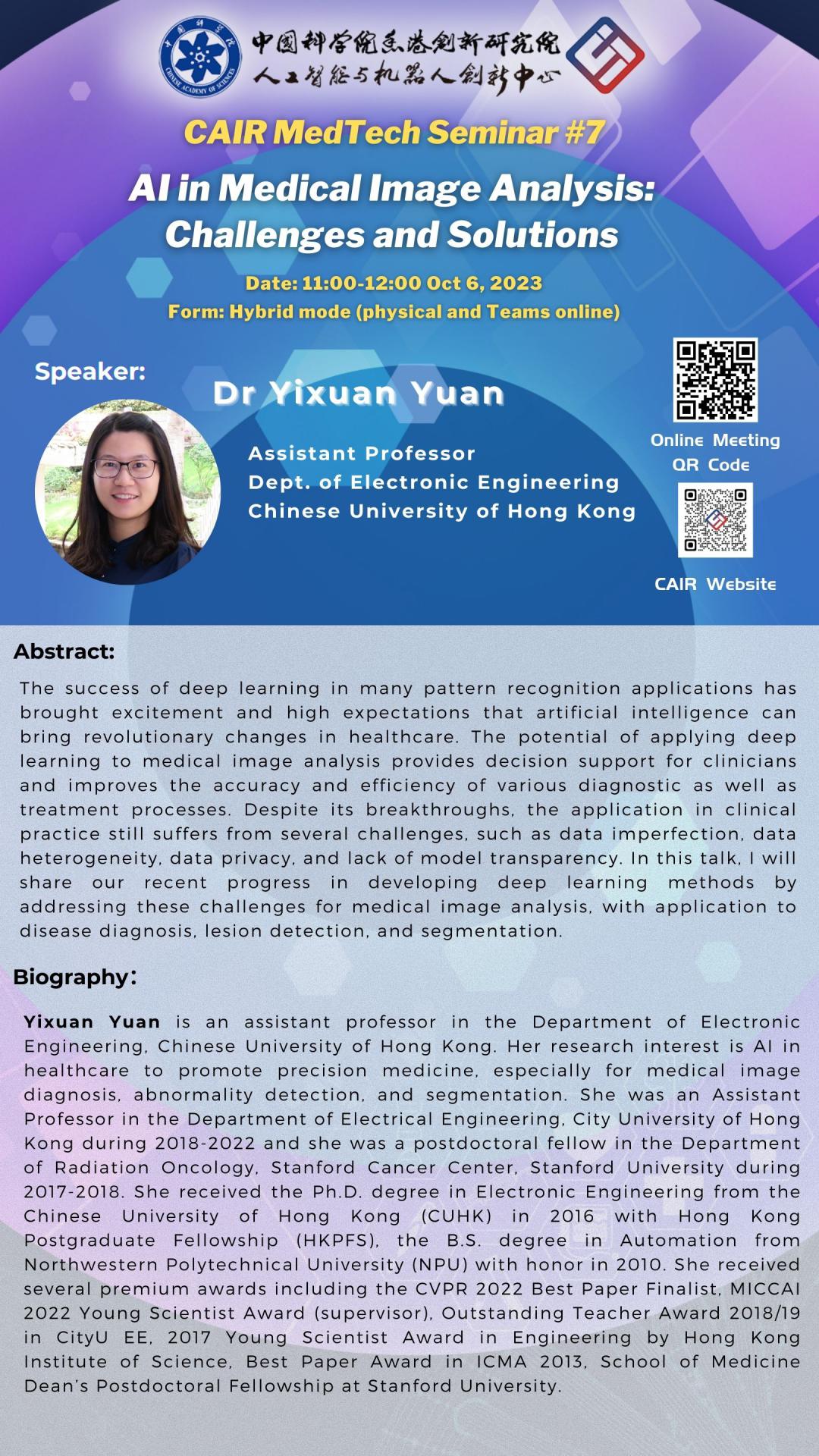 Biography: Yixuan Yuan is an assistant professor in the Department of Electronic Engineering, Chinese University of Hong Kong. Her research interest is AI in healthcare to promote precision medicine, especially for medical image diagnosis, abnormality detection, and segmentation. She was an Assistant Professor in the Department of Electrical Engineering, City University of Hong Kong during 2018-2022 and she was a postdoctoral fellow in the Department of Radiation Oncology, Stanford Cancer Center, Stanford University during 2017-2018. She received the Ph.D. degree in Electronic Engineering from the Chinese University of Hong Kong (CUHK) in 2016 with Hong Kong Postgraduate Fellowship (HKPFS), the B.S. degree in Automation from Northwestern Polytechnical University (NPU) with honor in 2010. She received several premium awards including the CVPR 2022 Best Paper Finalist, MICCAI 2022 Young Scientist Award (supervisor), Outstanding Teacher Award 2018/19 in CityU EE, 2017 Young Scientist Award in Engineering by Hong Kong Institute of Science, Best Paper Award in ICMA 2013, School of Medicine Dean’s Postdoctoral Fellowship at Stanford University.