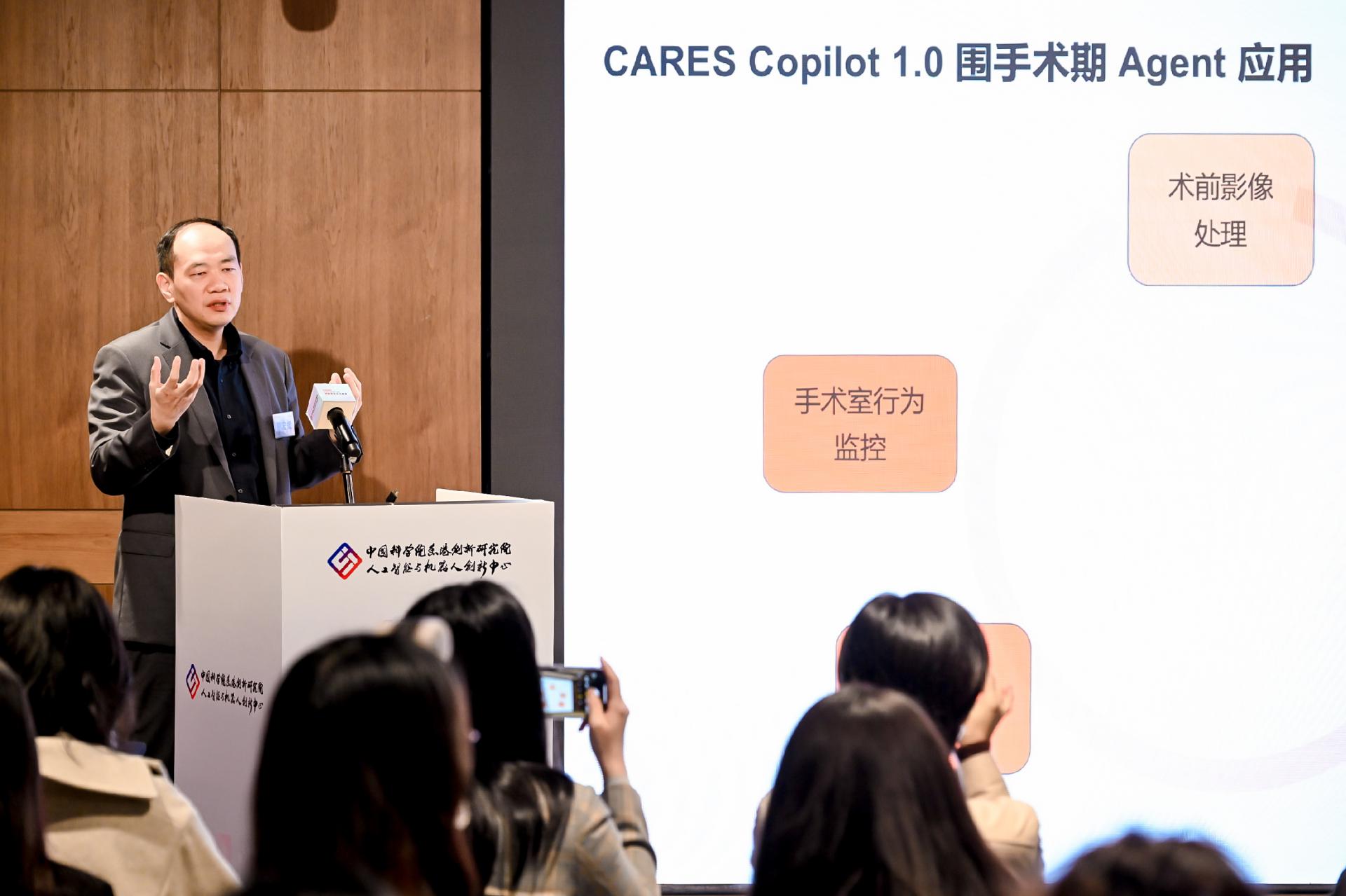 冯铭教授、康军教授、刘宏斌教授及陈达明医生(从左至右)合影 在新闻发布会上,中国科学院香港创新院AI中心执行主任刘宏斌教授发表了主题为《赋能医生 普惠患者:CARES Copilot 1.0手术大模型》的主旨演讲。刘宏斌教授详细介绍了CARES Copilot 1.0 在医疗领域的关键作用,并强调“我们认为检验人工智能技术价值的唯一标准是看它是否真正能为医生赋能,解决他们的痛点,拓展他们能力的边界。也只有这样,人工智能技术才会真正推动人类医学的进步”。