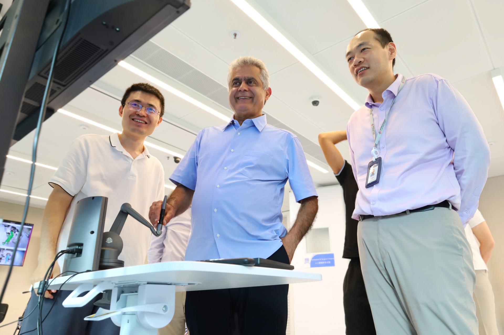 (左三至左十)朱献伦医生、潘伟生医生、陈达明医生、Victor HUI医生、Nassir Navab教授、刘宏斌教授、Peter WOO医生、Leo Yeung医生 在参观期间,CAIR执行主任刘宏斌教授向Navab教授展示了CAIR在具身智能手术室技术平台上的科技成果。其中CAIR自主研发的数字孪生系统给主攻计算机辅助医疗程序和增强现实的Navab教授留下了深刻印象。该系统是世界上首个实时脑外科手术数字孪生系统,利用高性能实时有限元仿真算法,可以高效地计算出脑部组织和手术器械中的复杂交互,并给出实时的仿真结果。此外,Navab教授还参观了包括多模态大模型CARES Copilot、微创柔性脑手术机器人MicroNeuro、全自动超声扫描系统Ultrasound Copilot等技术在内的多项医疗领域科技成果,并给予高度赞扬。
