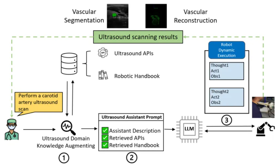 为了应对这些挑战,研究人员开发了一种创新的超声影像具身智能系统,将超声机器人与大语言模型相结合,提高了超声机器人的智能水平和操作效率。该系统采用了双重策略:首先,将大语言模型与超声机器人集成,通过理解超声领域的知识(包括API和操作手册),将医生的口头指令转化为精确的运动规划;其次,采用动态执行机制,根据患者的移动或操作错误实时调整扫描计划。