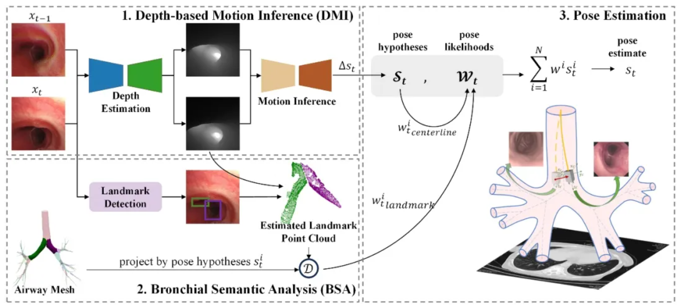 为了解决支气管镜定位的挑战,研究团队开发了概率气道导航系统(PANS),旨在通过多种视觉信息集成来增强定位的鲁棒性。PANS采用了蒙特卡罗框架,模拟经验丰富的外科医生的综合视觉方法,跟踪支气管镜的位置。为了实现在各种病例中的实时应用,科研人员构建了一个容纳31名病例的数据库,包含不同健康状况病人的胸肺CT及气管镜录像,以优化轻量级神经网络进行深度估计、运动推理和地标检测。通过与现有的先进方法进行的对比评估,展示了PANS在真实临床数据集上的卓越性能,在全气管镜导航中仅有8.7mm的定位误差,与其他方法相比误差降低了42.4%。负责项目研发的田庆瑶指出,PANS系统通过整合多种视觉信息,提高了支气管镜定位的鲁棒性和精度。这一突破将有助于克服现有视觉导航技术在临床应用中的障碍,为支气管镜检查提供更可靠和实时的定位支持。
