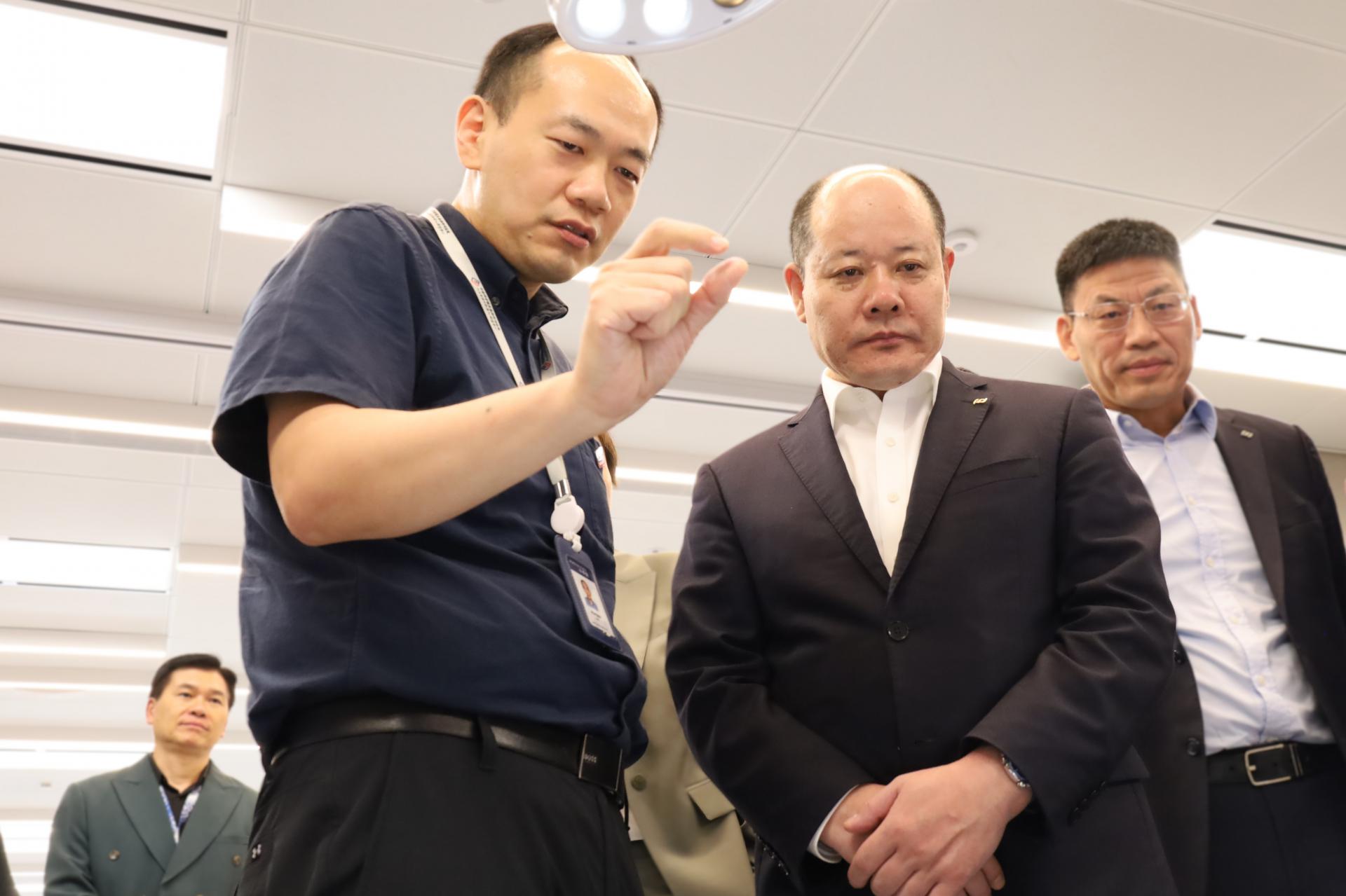 期间,刘宏斌主任向张为忠董事长介绍了CAIR着重打造的具身智能手术室,其上继集成了多模态手术大模型CARES Copilot、具身智能超声机器人系统、柔性微创手术机器人MicroNeuro等多项技术。其中CARES Copilot和MicroNeuro给张为忠董事长留下了深刻的印象。