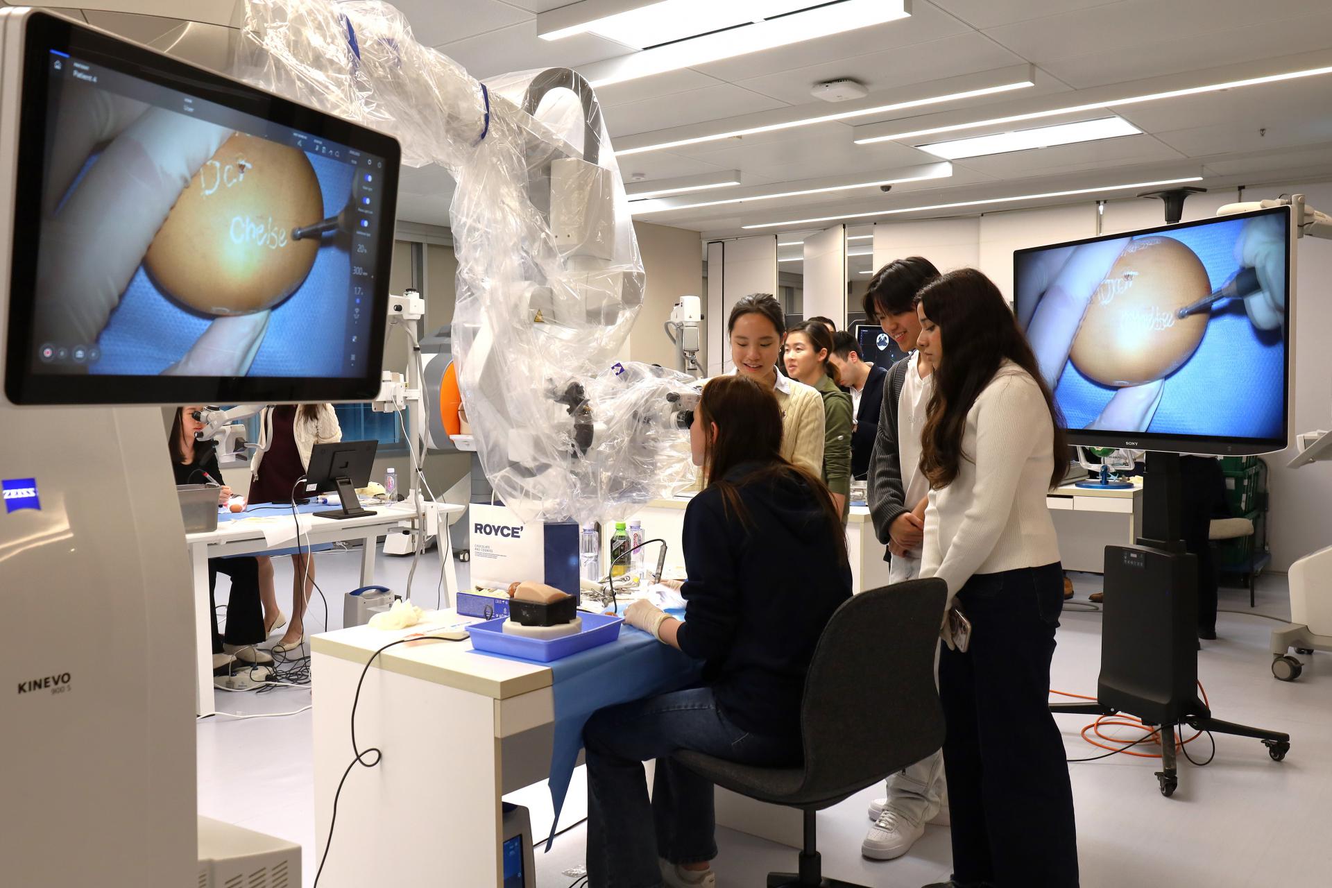 训练营内容聚焦于四大核心模块:显微外科、内镜与导航、钻孔与定位、影像与解剖。导师团队采用“理论与实践相结合”的教学模式,通过专题讲座深入浅出地讲解神经解剖学知识,帮助学员构建扎实的理论基础。在实操环节,学员在显微外科工作站进行镜下缝合和血管吻合训练,提升手眼协调能力;借助内镜设备直观获取颅内信息;通过颅骨塑形训练掌握安全入路技巧;利用真实手术器械进行鸡蛋表面研磨训练,掌握手术打磨的精准度。在陈达明医生等导师的示范与1:1辅导下,学员们积极投入各模块的学习,借助医学显微镜与高清影像设备进行精细操作,亲身体验实践操作的魅力,强化了理论知识的吸收。