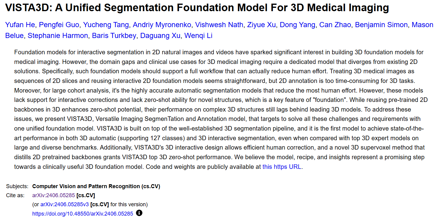 近日,英伟达联合多家机构推出的VISTA3D多模态医学影像分割模型,凭借其首创的三维超体素特征提取方法,实现了三维自动分割与交互式分割双模态的协同优化。在23个数据集的综合基准测试中,该模型的分割精度较现有最优专家模型提升了5.2%。