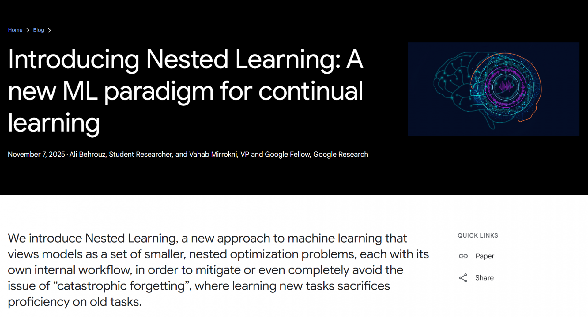 链接:https://research.google/blog/introducing-nested-learning-a-new-ml-paradigm-for-continual-learning/